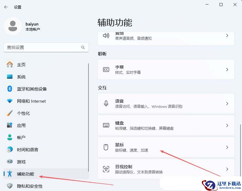 2、接着,在打开的界面中,点击左侧的“辅助功能”,并找到并选择进入到“鼠标”设置。