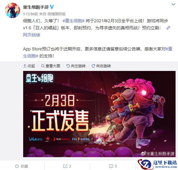 《死亡细胞》手游《重生细胞》国服将在2月3日上线iOS/Android平台,游戏将同步v1.6「巨人的崛起」版本,售价30元,安卓玩家可免费体验第一关。