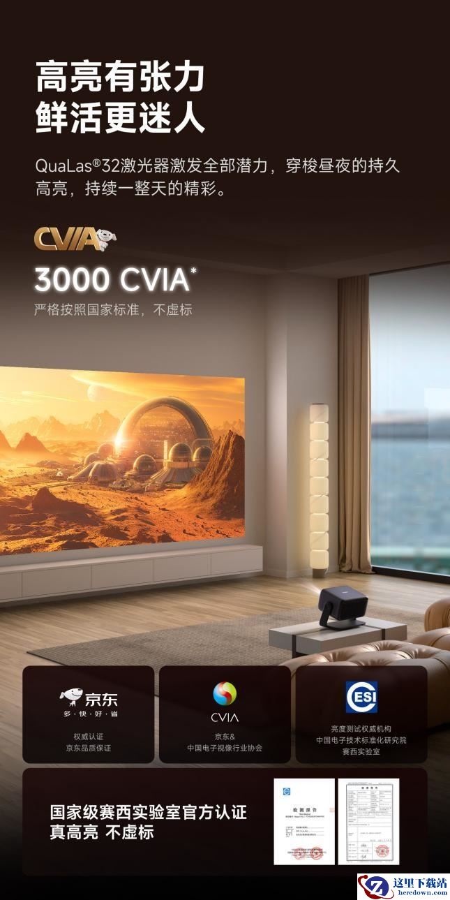 在亮度方面,当贝X5S Max使用ALPD激光,亮度达到2800 CVIA流明,当贝X7 Ma采用2组QuaLas 32激光器,并且采用了独特的光路黑化设计,进一步将亮度提升到了3000 CVIA流明。更强的亮度和抗光性,让投影仪在客厅开灯观影或者白天观影的场景下也能投出清晰明亮的画面。