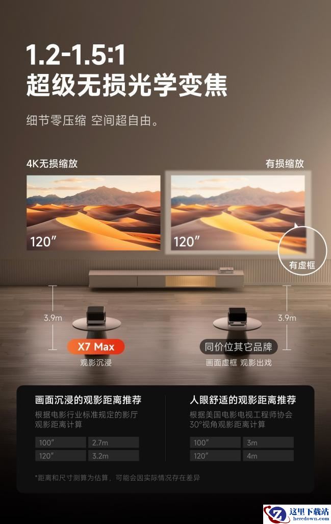 当贝X7Max搭配1.2-1.5:1超级无损光学变焦,可以在不移动投影仪的情况下,通过物理镜片移动来缩放画面大小,整个过程不损失任何4K画质清晰度,根据美国电影电视工程师协会30°视角观影距离计算出的人眼舒适观影距离,提供1.2-1.5:1的舒适光学变焦投射比。