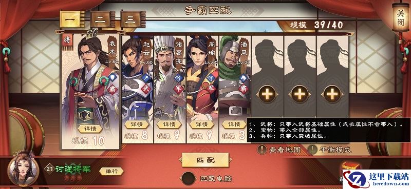 不过制作团队也很贴心的将主线分为了“三国编年史”和“讨伐模式”两种玩法。前者相对简单,玩家可以体验从黄巾之乱伊始,至火烧赤壁之时的三国故事;而后者则需要玩家有一定战棋基础,在有限的资源限制下,挑战子龙救幼主、曹操下邳诛吕布等经典剧情的高难度副本。除此之外游戏中还有诸如平乱、决斗、战役等PVE玩法,可以满足不同玩家的口味。