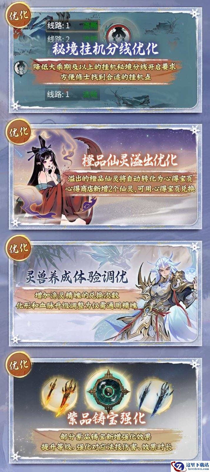 此外,12月将降低部分挂机秘境分线开启要求;溢出橙品仙灵自动转化为心得宝页,可用其兑换指定仙灵;灵兽化形和血脉升级调整为仅需通用精魄;紫品铸宝真火双刃、业火双刃和两仪阵盘新增强化效果。