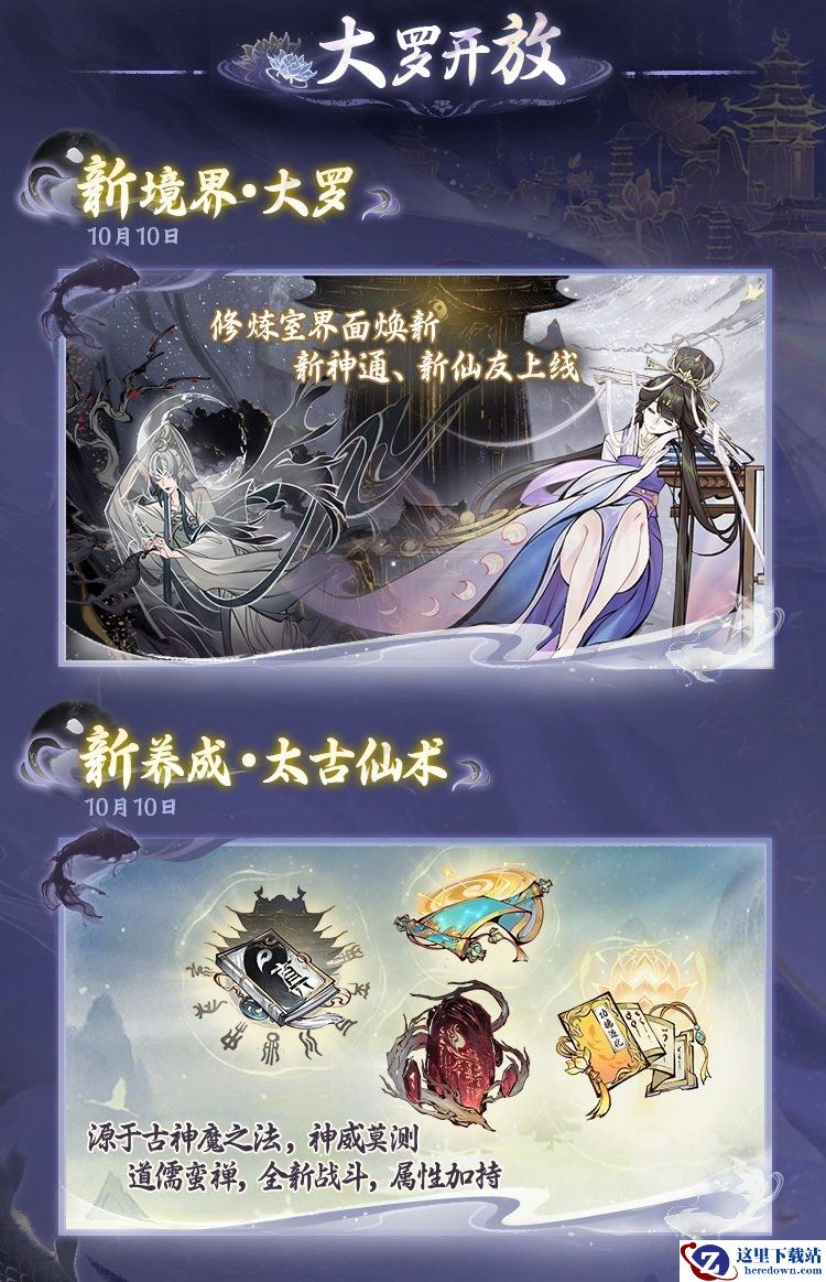 大罗境界10月10日开启,修炼室界面焕新,对应法宝、丹药、仙友等内容同步更新;新增2个大罗境界秘境和1个宗门秘境,全新仙域静待仙友探索;新增养成“太古仙术”,含儒、道、蛮、禅四大派系,修炼可解锁技能,提升属性。