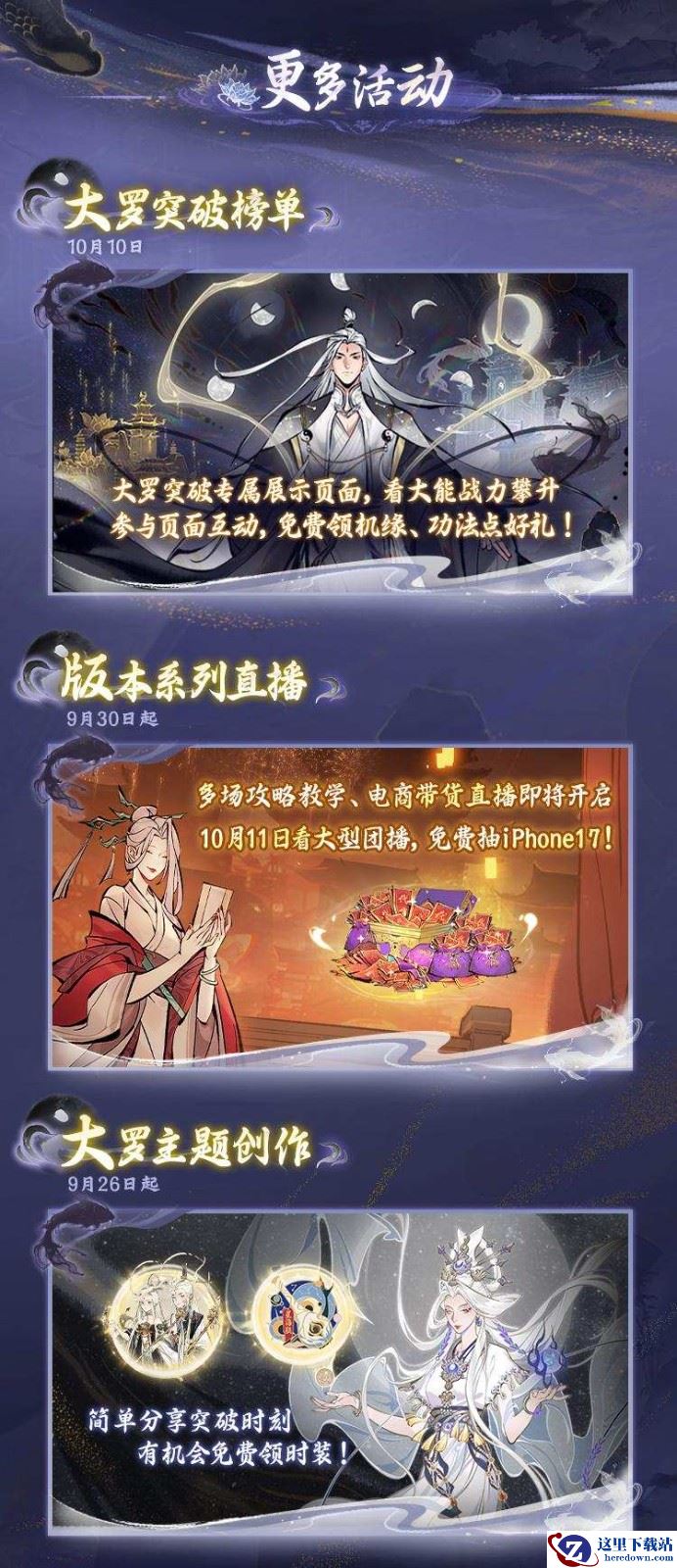大罗突破榜单将随大罗境界同步开放,围观大能战力攀升,互动领机缘等好礼;版本系列多场直播即将开启,看大型团播,免费抽iPhone17等大奖;参与大罗主题创作,有机会免费得时装!
