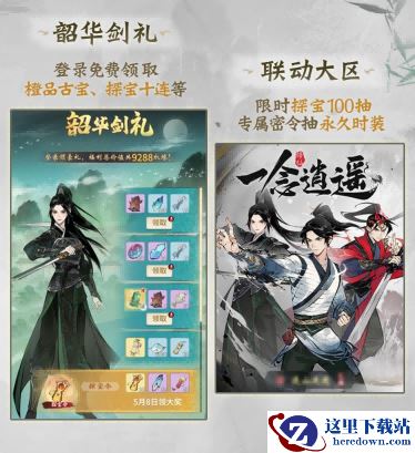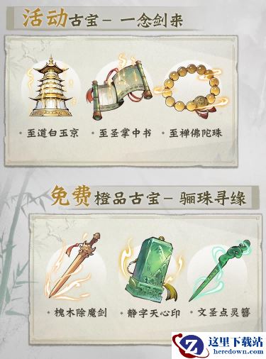 联动限定古宝上线,参与韶华剑礼等活动,可免费获取橙品古宝套“骊珠寻缘”,集齐可提高玩家神通伤害,增强自身实力。