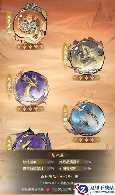 一共有八个血脉可以升级,累积消耗一定血石,还可以提升修士修炼速度、引魔香效率等挂机属性。最后每人至多能装配三个妖化进入战斗,在战场上变身不同大妖,发挥不同技能,整个策略十分多样化。