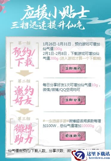 一念逍遥手游的祖儿小师妹应援活动在火热进行中,1月26日-2月26日期间,玩家们都可以通过预约或下载游戏、分享好友或微博助力,为祖儿积累个人仙气值,提升更多全员仙气值,除了解锁上述物料外,还能陆续解锁抖音、微博资源等更多惊喜!