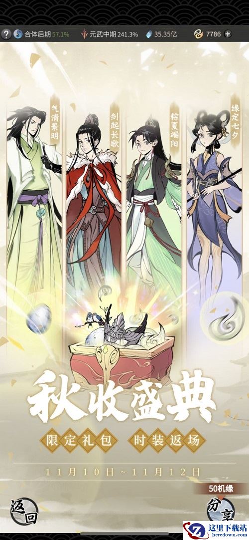 暑气渐消、秋意更浓。在此时节,《一念逍遥》为仙友们筹备了一场盛大的秋收盛典,11月10日8:00~11月12日24:00,部分限定时装将以返场形式上线,包括:气清景明、剑起长歌、粽夏端阳和缘定七夕。此外,活动期间还将限时开放庆典三日签到、月卡购买福利、限定时装返场限购以及庆典特惠礼包,各位仙友不容错过。