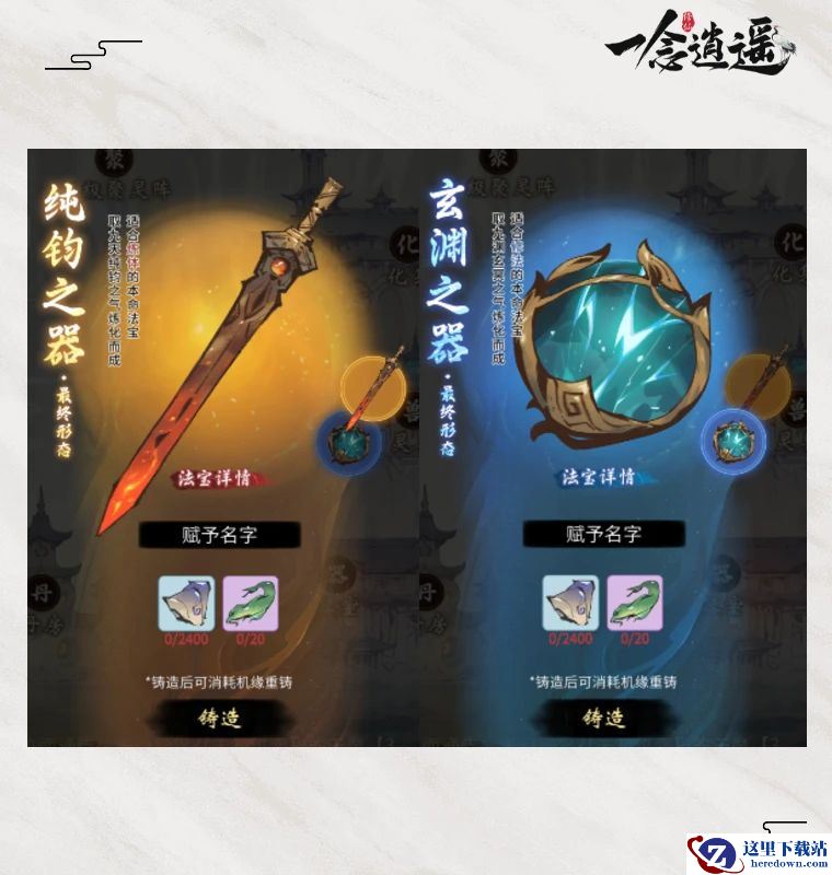 纯钧象征尊贵无双、玄渊象征深藏奥义。仙友们可从“纯钧之器”和“玄渊之器”两大方向选择一个进行铸造,分别适合“炼体”和“修法”。如果发先选择的方向不合适也没关系,只要耗费少许机缘,即可无损重铸,更换方向,不必担心耗费培养资源。