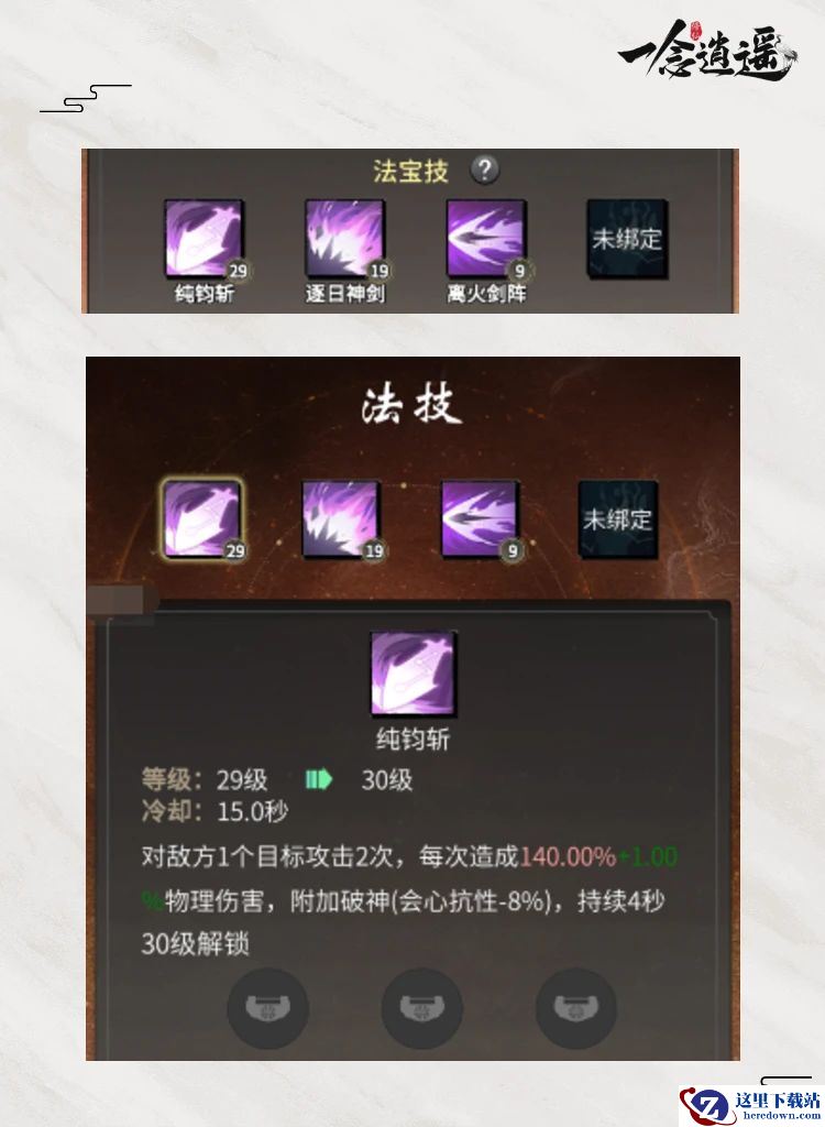 随着本命法宝的成长,将会解锁更多的法技,每个本命法宝可学习4种法技,除3个固定的专属法技之外,第4个绑定法技可通过天地宝物进行铸宝后自由选择。(绑定法技目前暂未开放)