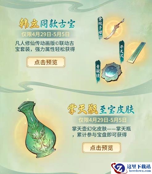 此次的联动内容除了有《凡人修仙传》作品内“赤色禁地”的新玩法、韩立同款古宝之外,玩家们还能够得到《凡人修仙传》动画韩立门派“黄枫谷”套装,化身黄枫谷修士除魔卫道,以及造化至宝新皮肤——掌天瓶!真实还原韩立寄身宗门,培养灵植、努力修炼的情景;还有签到、宝盘以及《凡人修仙传》知识问答等活动,以及上万机缘奖励,韩立也会在登录界面引领仙友们进入游戏,和好友厉飞雨于城镇中出现,与玩家一同探讨修仙之道。