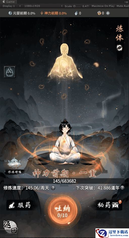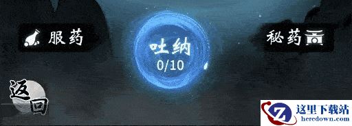 吐纳居中放置,交互按钮以体法区分色彩,流光周转,体现周天灵气汇集。