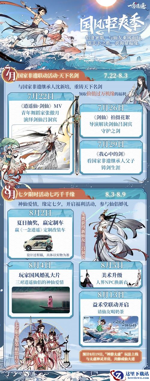 热情盛夏,逍遥修真界即将迎来这位真正的铸器大师。立即下载《一念逍遥》,与沈老师合作,寻古韵,解图纸,共铸天下名剑。沈老师亲手打造的“吕仙剑”,化身全新古宝,助力仙友修行!参与活动,重铸吕仙宝剑,获得仙友“吕洞宾”,与剑仙一起轻松修仙。还有抽奖送定制改装车等活动,等你参加!