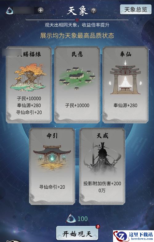 仙友可使用天象玉进行观天,获取民愿、奉仙、命引、天威、天赐福缘等天象,从而获得子民、奉仙源、寻仙命引、投影属性收益。当前仅开启白品天象,仙友可通过仙界秘境、秘境储物袋获得,新的天象玉获取方式则会在后续进行更新,还望仙友海涵。