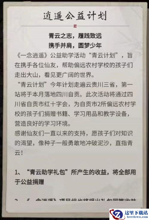 “青云助学礼包”所产生的收益,将全部用于公益捐赠,同时《一念逍遥》项目组也将捐出礼包同等收益金额,一并用于公益捐赠。“青云助学礼包”所产生的收益及官方捐赠金额的使用详情,后续将在《一念逍遥》官网进行公示,仙友也可通过【活动】-【逍遥公益】,跳转至公益专题页,查看公益活动详情。