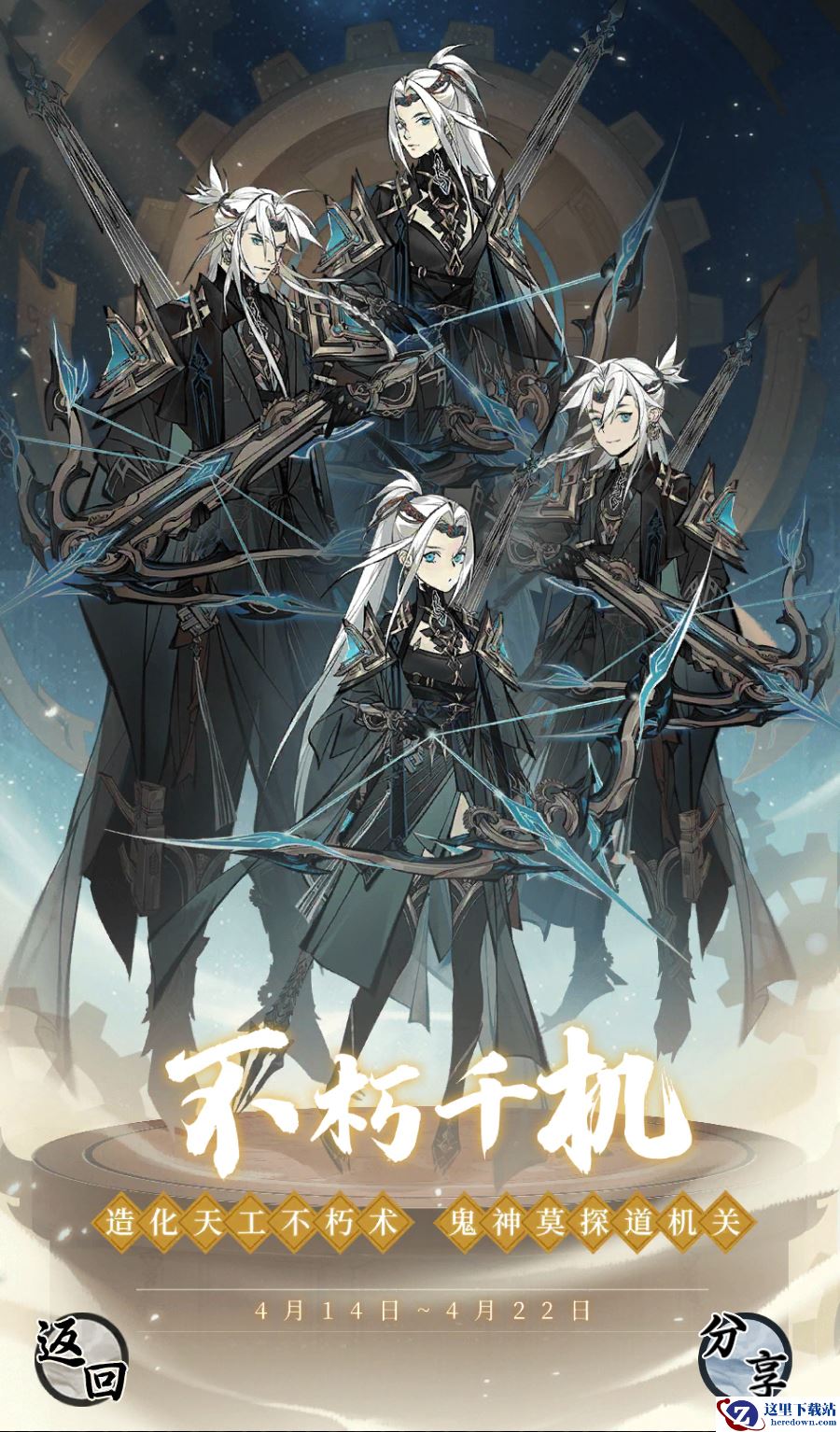 造化天工不朽术,鬼神莫探道机关。“不朽千机”活动将于4月28日上线,活动内含机关术主题橙品时装和灵画,玩家可手持千机巧弩,穿戴机械装束,翻飞于楼宇瓦砾之间,领略传统机关术的艺术美。限定玩法“百家争鸣”、橙品古宝套装“不朽千机”、全新幻化套装“鲁千机”、橙品仙灵“桃花妖”等内容,也将同步上线。