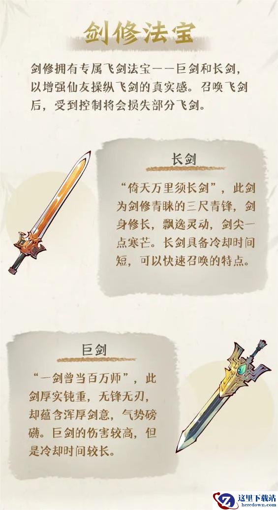 剑修拥有专属飞剑法宝-巨剑和长剑以增强玩家操纵飞剑的真实感。召唤飞剑后,受到控制将会损失部分飞剑。
