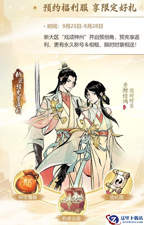 全新大区“戏颂神州”9月28日正式上线,即日开启预创角!本次主题服还有元婴挑战赛等活动,瓜分10万现金大奖,还有机会获得满时装角色号(无法返场的服装除外,详见活动规则)。各位记得早点创角,争取以最快速度开启修炼!