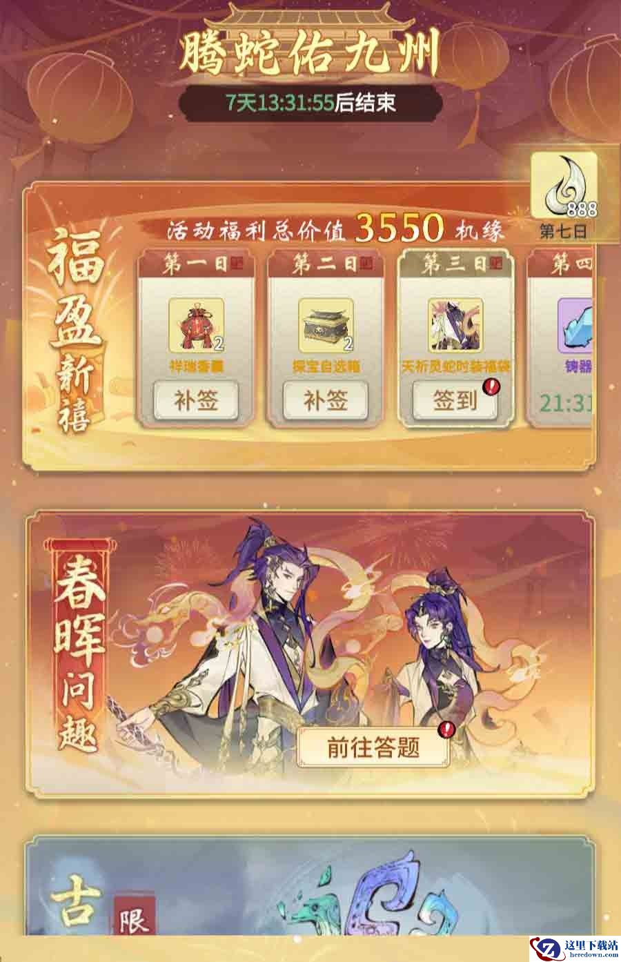1月27日~2月5日,“腾蛇佑九州”活动全服开放,活动主体内容包含签到答题、新岁绘图、新春趣旅、兑换宝库、乙巳年兽、弈趣仙棋、口令红包等。可免费领取探宝令、888机缘等好礼;有机会获取限定时装&灵画天祈灵蛇、幻化白前辈等奖励;积攒春响竹,可兑换造化玉等珍稀宝物。