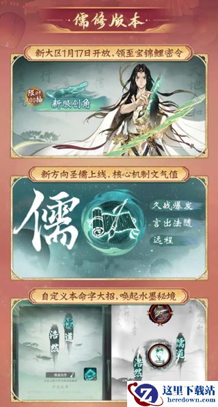 四周年新大区【儒道浩然】将于2025年1月17日开放,送至宝锦鲤密令和限时探宝100抽!新修炼方向“圣儒”将于17日同步上线,可体验全新文气机制和本命字大招玩法,还有限时言出法随活动,同时转修功能将于25年2月内上线,无负担体验新职业,轻松修炼!