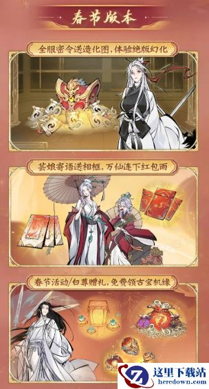 蟠蛇迎新春,共贺四周年,春节版本将于2025年1月27日开启,1月24日即可领取春节登录福利,免费获橙品古宝和大量机缘!本次春节版本福利加码,全服密令送造化图,免费体验绝版幻化,芸娘寄语送相框,春节周年都有红包雨!参与春节活动【腾蛇佑九州】,可获取蛇年主题限定时装,古宝,和首个双形态联动幻化·白前辈,更有双人对弈趣味玩法和洞府烟花秀返场!