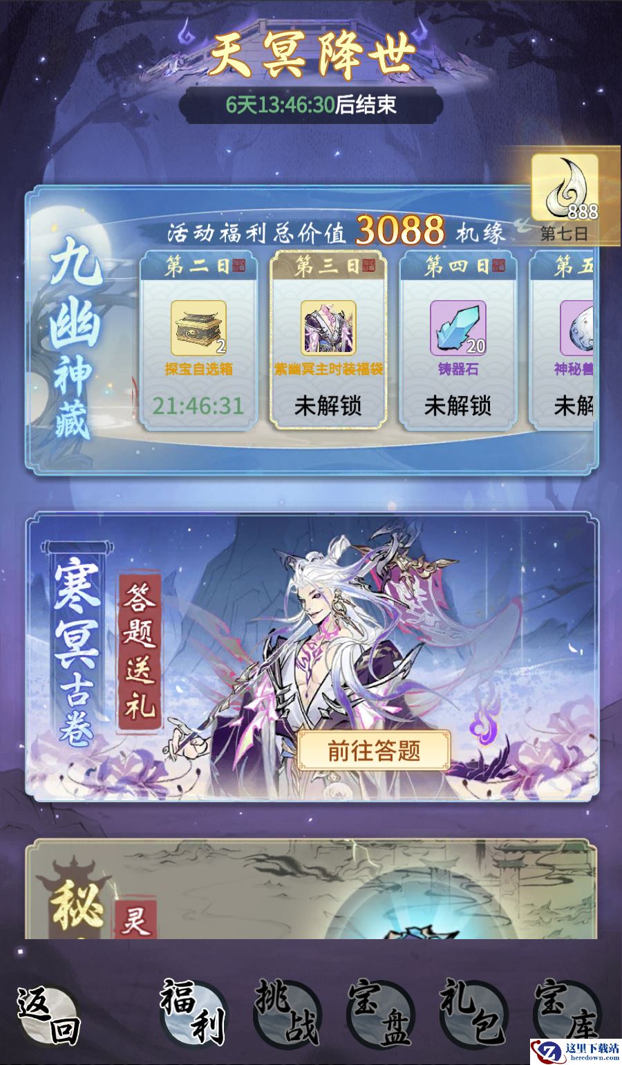 7月12日~7月18日,“天冥降世”活动全服开放,活动主体内容包含签到答题、双卡赠礼、精魄转换、福利转盘、兑换宝库、超值礼包等。可免费领取探宝令、888机缘等好礼;有机会获取限定时装&灵画、幻化鬼剑萧情等奖励;积攒彼岸花,可兑换造化玉等珍稀宝物。