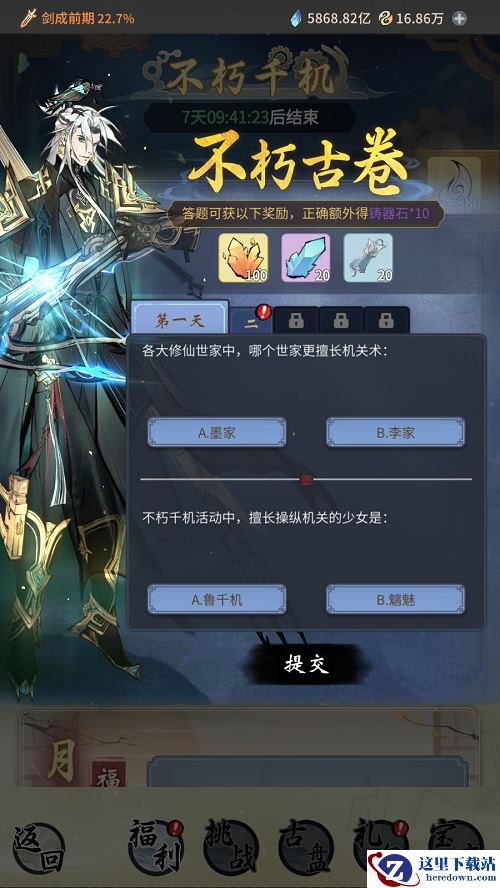 造化天工不朽术,鬼神莫探道机关。活动期间,仙友每日登录即可领取活动特礼;活动期间参与问答即可获得答题奖励,回答正确可额外获得奖励;活动期间仙友购买或续费月卡可获额外奖励,活动开始前一周内购买或续费月卡的仙友,亦可领取额外奖励。