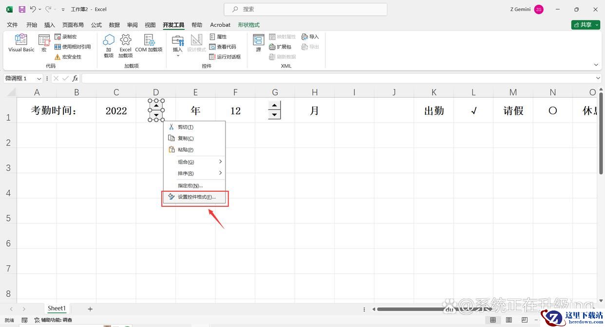2、点击【开发工具】-【插入】-【表单控件】-【数值调节钮】,然后按住鼠标左键,分别在年份“2023”和月份“12”后空白单元格绘制按钮。