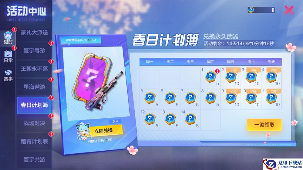 4月11日至4月24日,每日登录签到完成春日计划,可兑换A级枪械皮肤自选卡,含新皮肤“春晓”,快快行动起来吧!