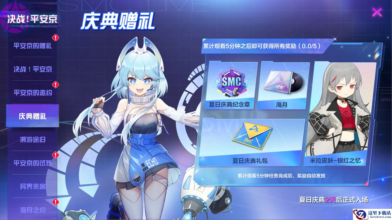 观看夏日庆典累计五分钟,即可获得米拉A级外观“银红之忆”、夏日庆典纪念章、大厅音乐“海月”以及夏日庆典礼包!