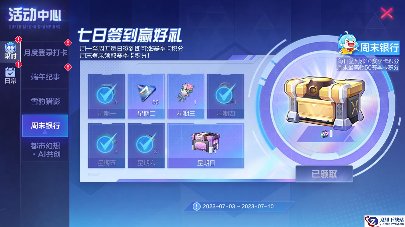 全新每周登录打卡活动“周末银行”即将于7月3日上线,每日打卡领即可取常规签到奖励,同时每次存入赛季卡积分奖励至“周末银行”,周末最高能领取50赛季卡积分!