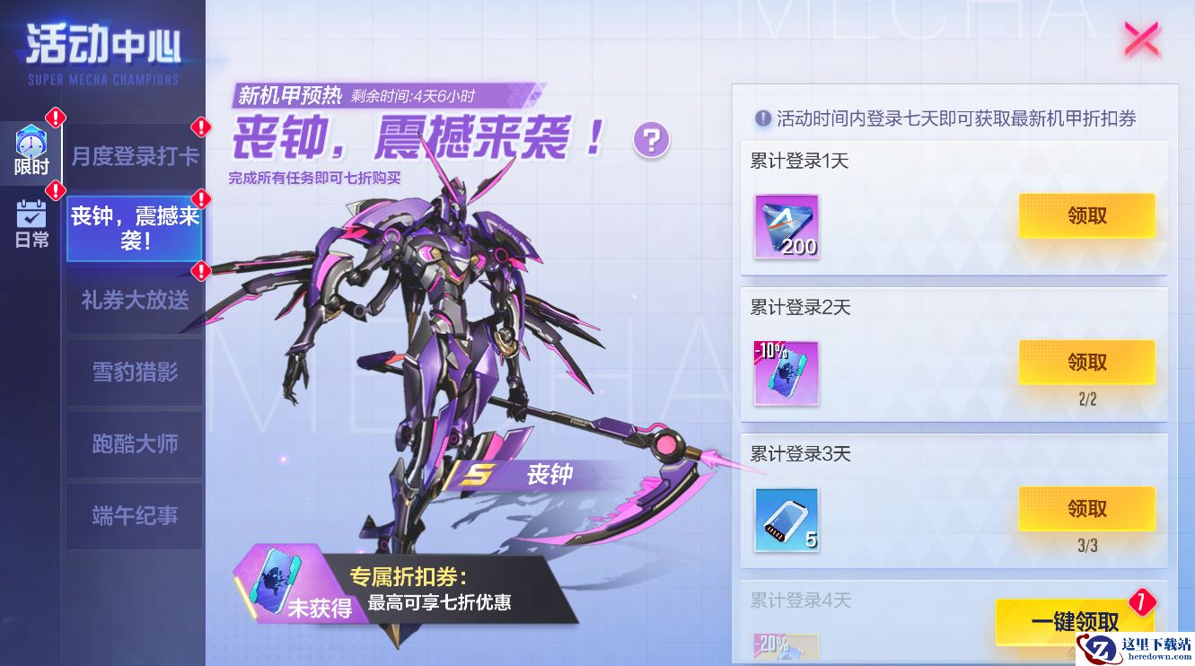 新机甲即将上线!6月15日至6月22日,每日登录领取好礼,最高可获得丧钟七折购买折扣券!