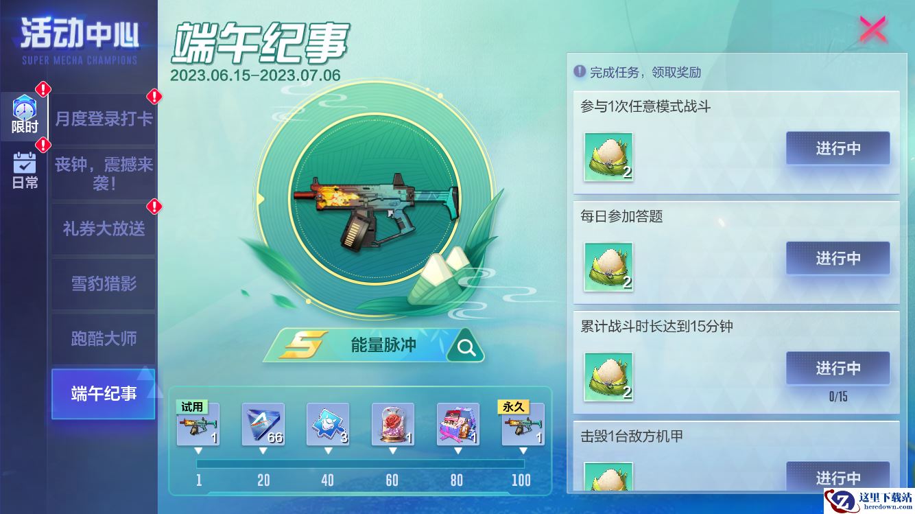 6月15日至7月6日参加端午纪事活动,完成任务即可领取粽子道具,兑换最终大奖“能量脉冲”冲锋枪皮肤!
