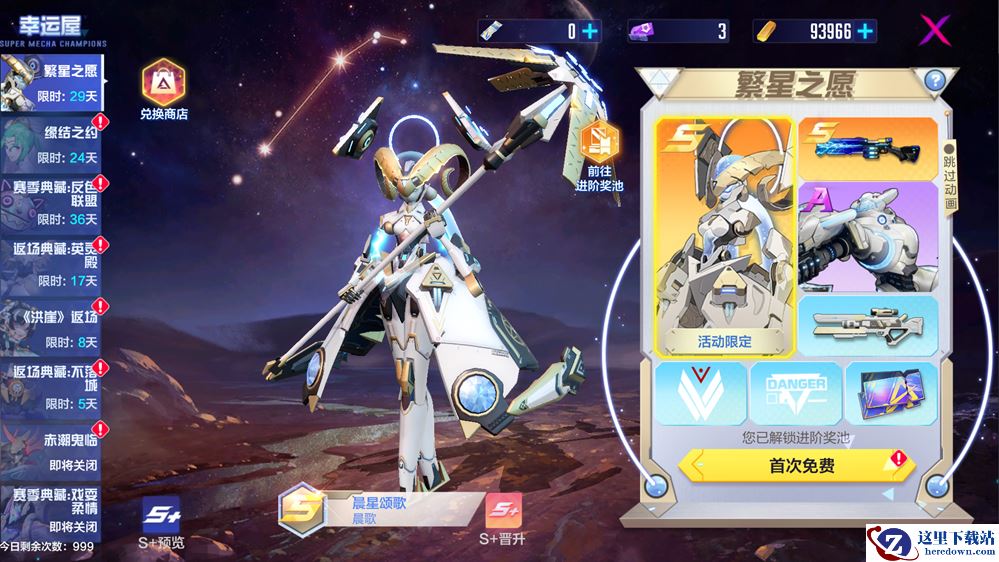 在获得晨歌S级外观 “晨星颂歌”后,更可开启进阶奖池,获取外观晋升卡,解锁专属S+形态