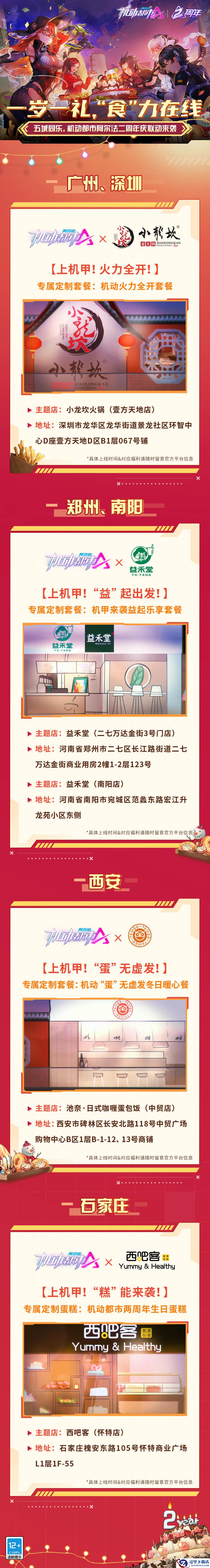 相伴两载,纵横寰宇。为了让机动都市的驾驶员们感受到火热的庆典氛围,《机动都市阿尔法》携手五大城市的知名品牌,以主题店和联动套餐商品的形式为玩家送上惊喜,更有特别福利等候解锁。届时玩家可以前去这些店铺体验,让自己在本次二周年庆典中留下一段“舌尖上”的回忆。