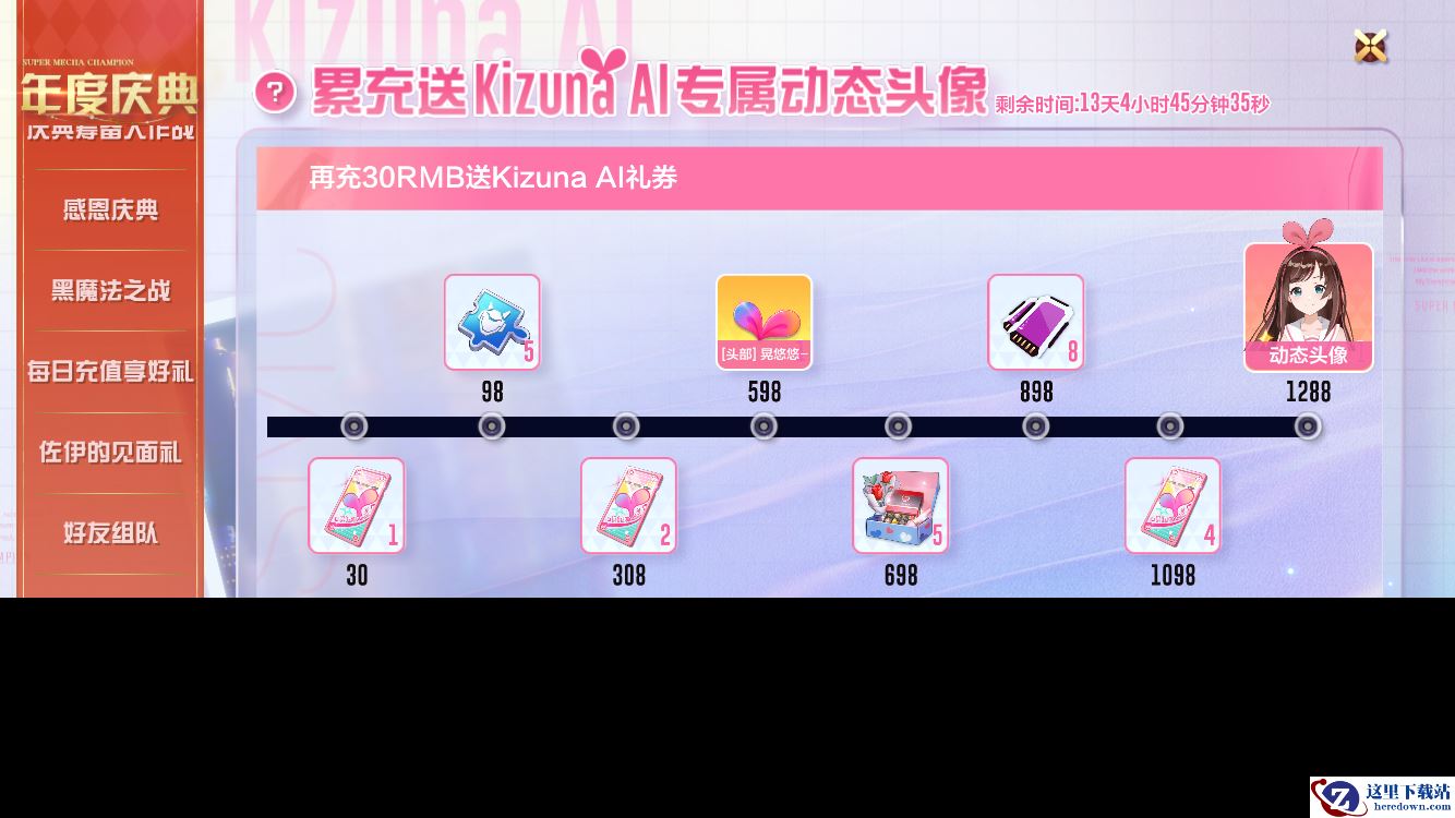 活动期间累计充值可得多样好礼,包含动态头像“Kizuna AI动态头像”等独家奖励!