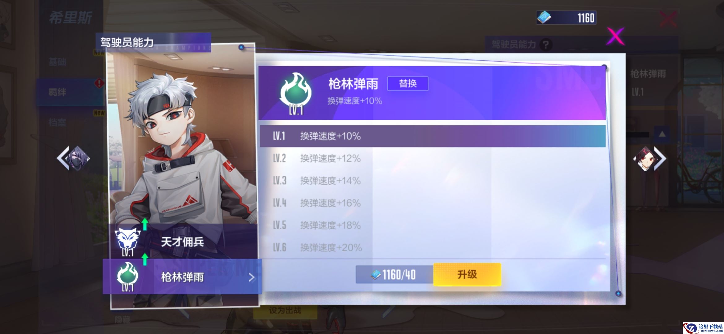 希里斯的人物天赋是天才佣兵,切换武器后3秒-4秒内伤害增加5%-15%,冷却时间20秒;机甲专精是枪林弹雨,可以使机甲的换弹速度增加10%-20%。这两个技能特点与希里斯喜欢重火力的个性十分契合,不愧是枪火主宰者。8月5日前购买希里斯还可获得A级皮肤“橙色信号”!
