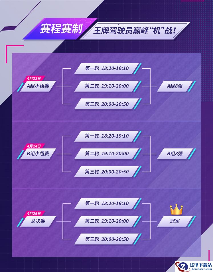 据悉,本届赛事将于4月23日—25日每晚18:00上演,赛程为期3天,参赛队伍被随机分为A、B两组,分别于4月23、24日进行小组赛。每组经过3轮激烈角逐,将产生各自的8强队伍,组成最终16强,在4月25日向总决赛发起最终冲击!