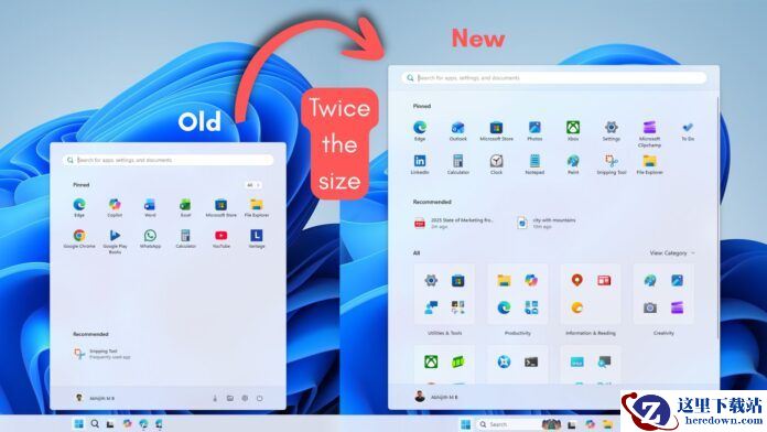 新版 Windows 11 开始菜单的大小几乎是旧版 Windows 11 开始菜单的两倍。