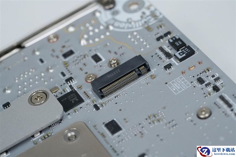 换一个角度可以清楚的看到SSD位置的多层结构,在寸土寸金的ITX主板上通过多层叠加的方式,巧妙的将PCIe 5.0 SSD的M.2插槽布置在主板芯片组的上方。