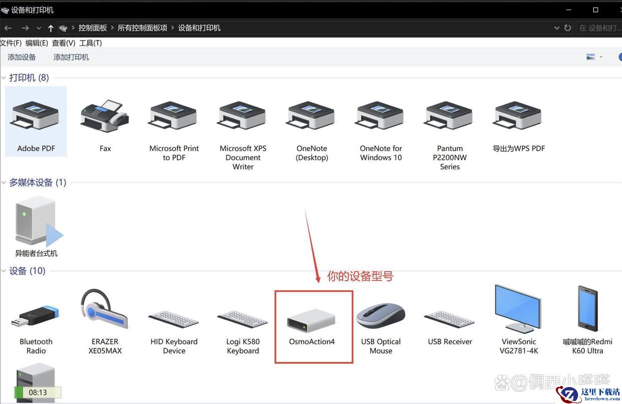 这里有的系统会自动弹出大疆的文件夹。有的需要看下在电脑右下角也会出现一个类似U盘接口的图标。在图标上点击鼠标右键,进入设备和打印机窗口,就会看到在设备列表里有你的大疆设备型号: