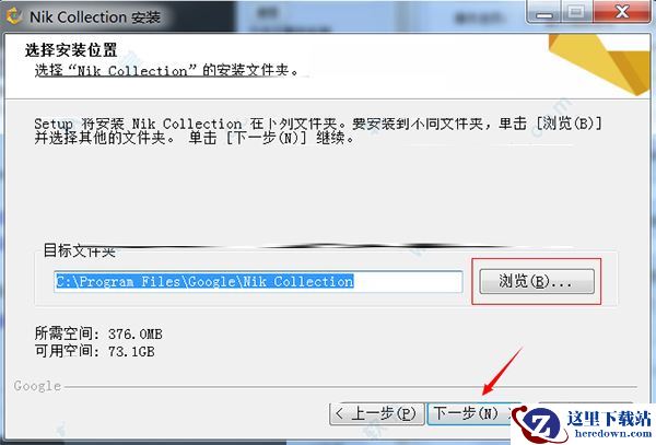 3、自定义软件安装目录,默认路径为“C:\Program Files\Google\Nik Collection”,安装路径选择时不要带有英文符号的路径,点击“下一步”继续安装;