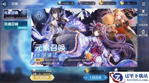 本期元素召唤卡池为【水银律法】,只包含灵魂召唤卡池中水银元素的人偶,第一期元素召唤卡池开放时间为:2022.03.31-2022.04.07。