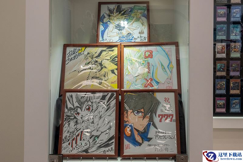 卡牌墙边上是一个特别的橱窗,里面展示了《游戏王》历代动画画师的签名色纸,对于动漫粉丝而言,具备非常大的吸引力!