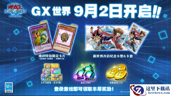 为庆祝《游戏王:决斗链接》GX世界开启,9月2日起登录游戏,即可免费领取镜碎特效限定卡片「元素英雄 火焰翼侠」以及「羽翼栗子球(异画)」,GX世界开放纪念卡套&卡垫,100个技能筹码以及相当于20包卡包的1000宝石!此外,累计登录满6天,更可领取合计6张卡片兑换券,其中包含1张超凡梦想兑换券和1张稀有梦想兑换券,可以任意换取一张现有卡盒中的超凡卡和稀有卡!