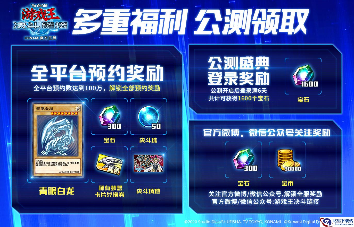 在特别节目上,策划代表波波为我们介绍了公测福利内容。事先预约的玩家和新玩家都可以在公测后获得600宝石、30000金币以及50决斗珠。为庆祝官网预约人数突100万,所有玩家不仅可以获得一张镜碎的经典版本「青眼白龙」,还将获得一张「稀有梦想卡片兑换券」(可以兑换任意一张稀有卡)!作为公测开服期间的特别福利,登录游戏的玩家都可以获得宝石奖励,登录6天总共可以获得1600宝石,相当于32包卡包!