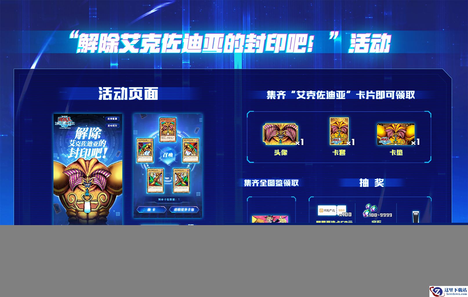 除上述福利以外,活动【解除艾克佐迪亚的封印吧!】也在火热进行中!集齐5张「被封印的艾克佐迪亚」卡片即可获得限定卡套、卡垫和头像,还有机会获得PS5、AirPods Pro、游戏王OCG传奇黄金礼盒、网易严选卡以及宝石等豪华奖励!立即用微信扫描图上二维码参与活动吧!
