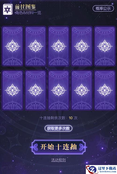 玩家每次通过十连抽,可以点亮解锁抽出的角色卡和材料。
