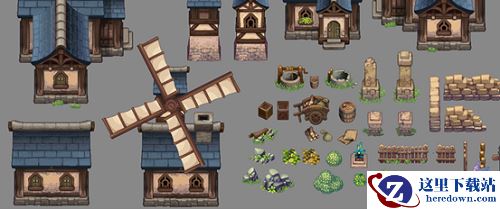 同时,为了符合下层的设定,大部分的建筑都是比较破旧的,而在加了风车元素后,整个村镇的风格,会更偏向乡村一点,建筑以砖块+木板为主,也会辅助的去加入水井、马车等去烘托这个氛围。