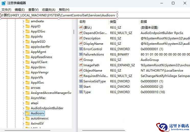 2、接着,在打开的界面中,依次点击打开“计算机HKEY LOCAL MACHINESYSTEMCurrentControlSetservicesAudioSrv”。